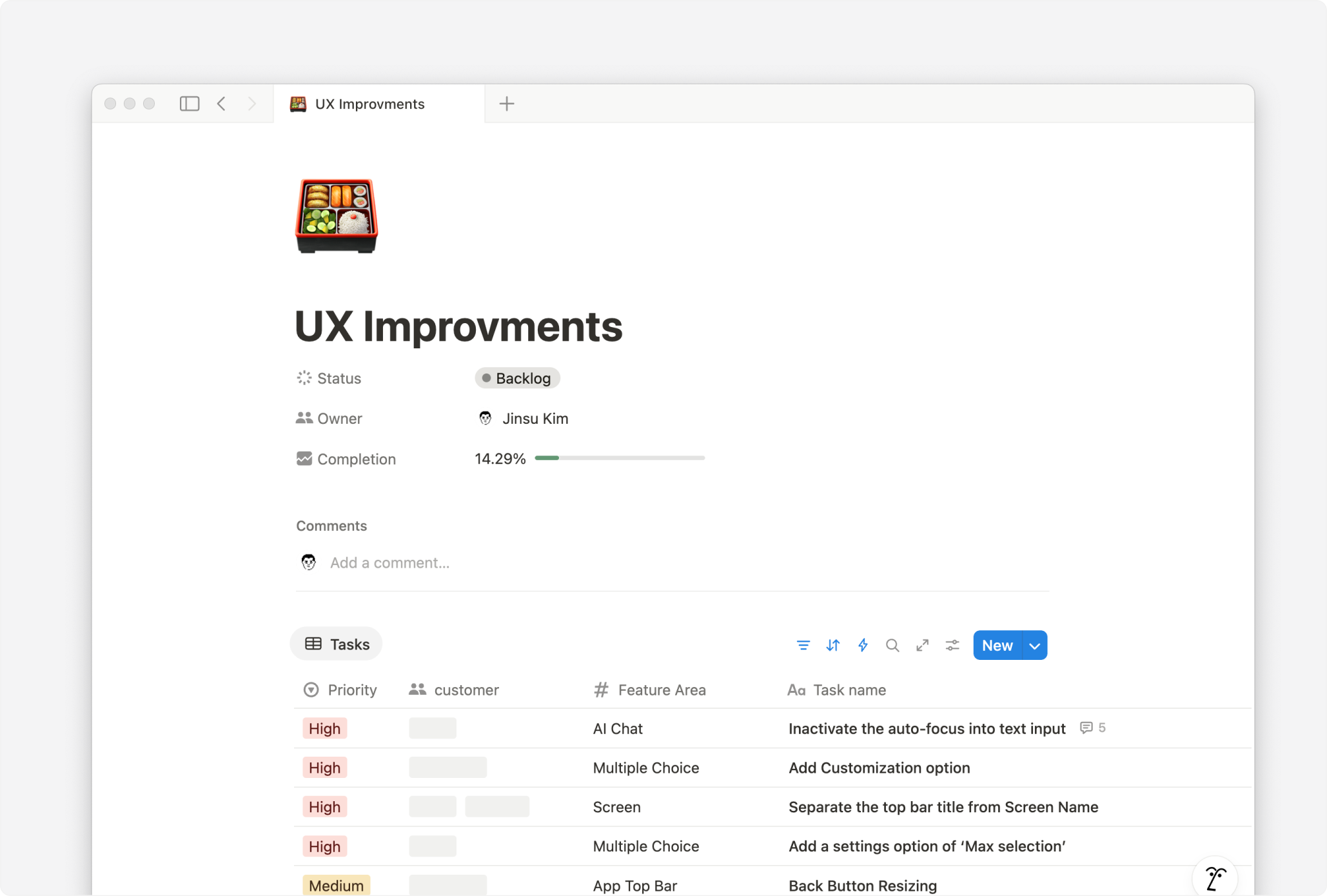 All feedback-driven tickets are managed in our UX Improvement database in Notion. I review and share them weekly during our internal sync meetings.