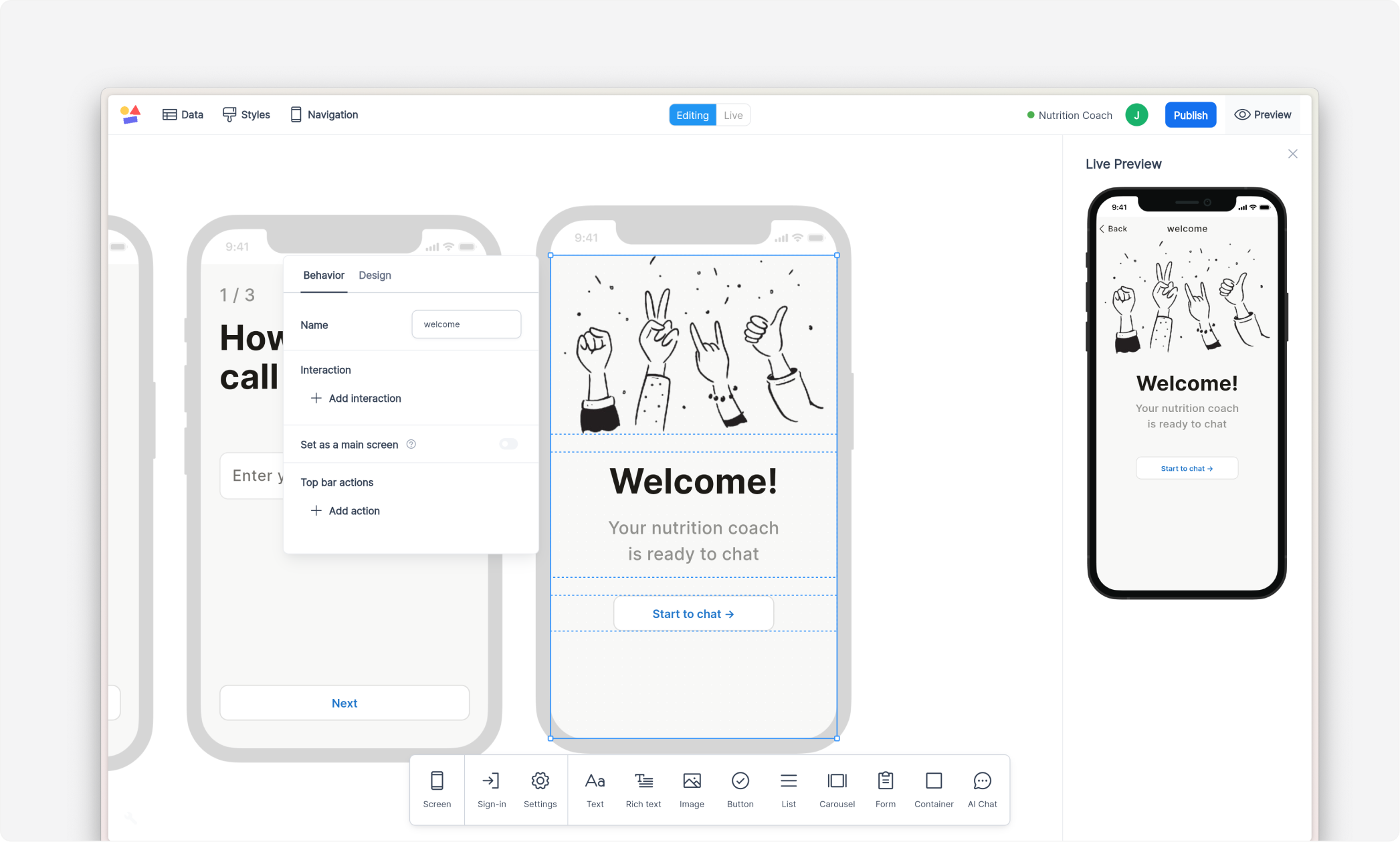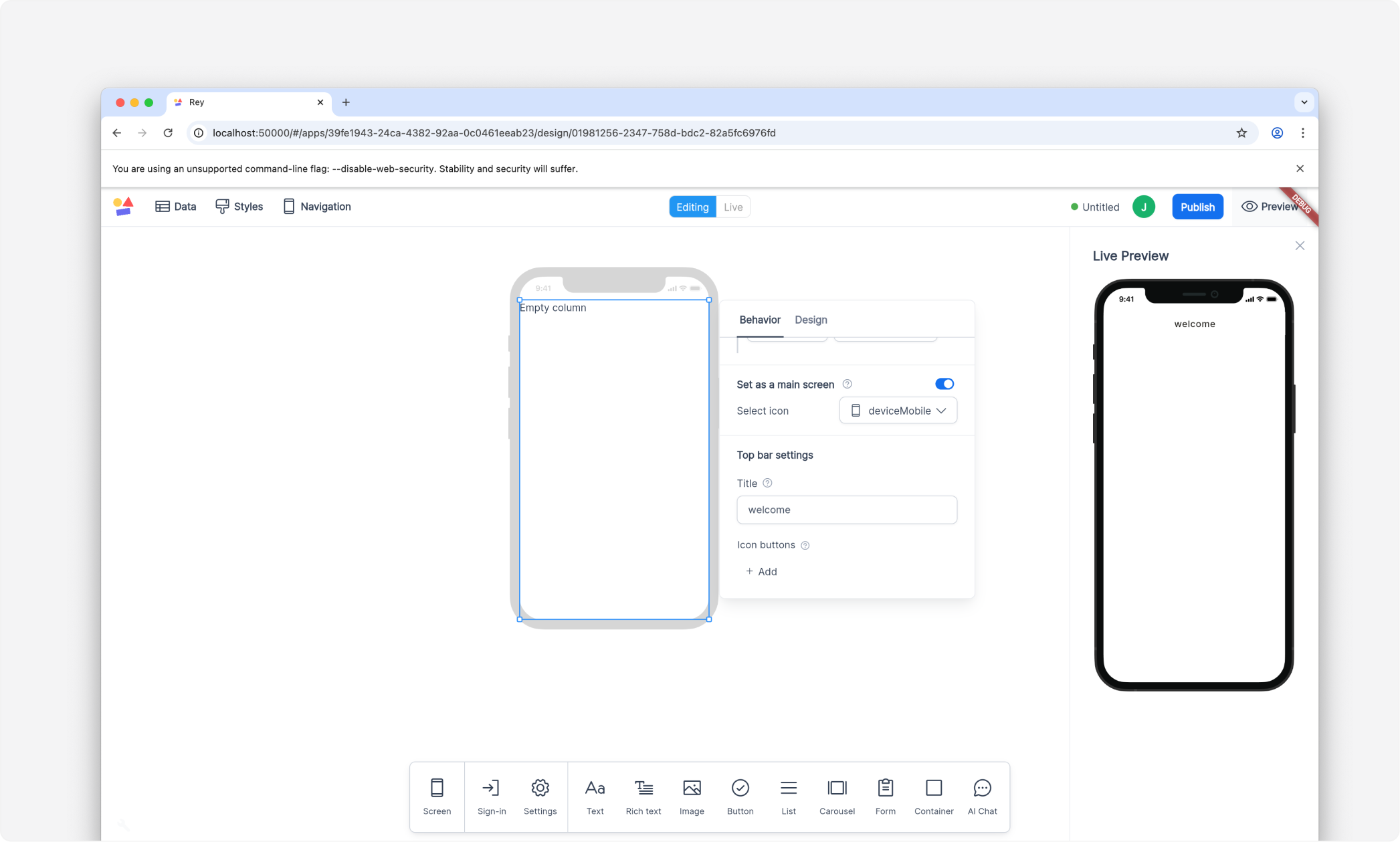 In Rey’s app builder, every screen has a name. This name is mainly used internally — for organizing screens, setting up navigation, or identifying the starting screen.